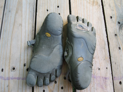 I bought my first pair of Vibram KSOs about two years ago and wore them into the ground. This year I bought some new ones, so the first pair had been pushed down to yard work shoes. This weekend my wife and I are participating in the Warrior Dash in North Texas. Part of the race tradition is to toss in the shoes you wore during the race. Mine have definately seen better days.